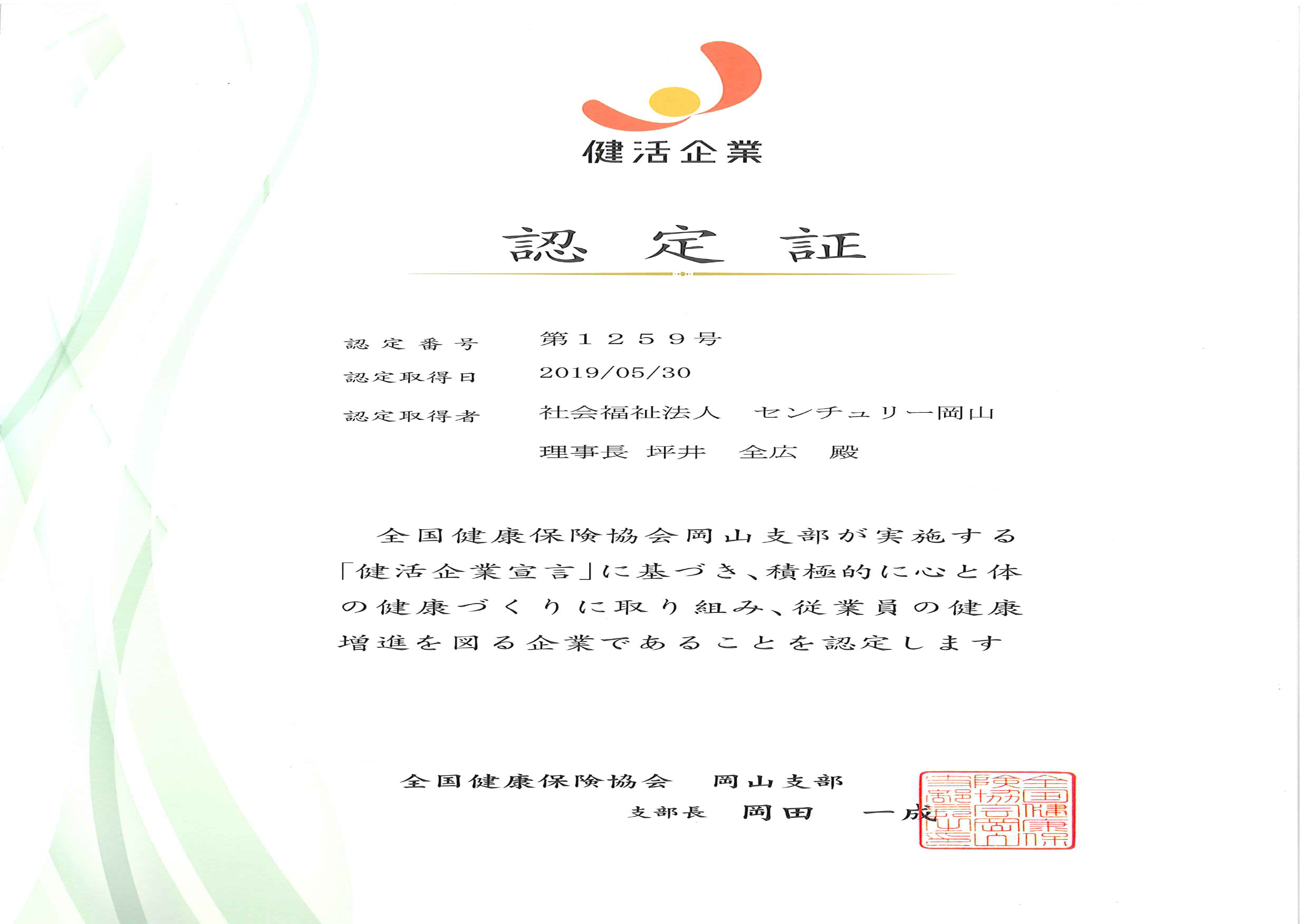 社会福祉法人センチュリー岡山は健活企業に認定されました。